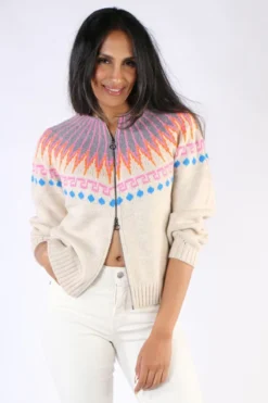 Longline cardigan in soft wool rich knit with fluffy spot detail for texture. The Novel cardigan has a high back neck for warmth and falls just below the knee with rib hemline. Style 7419SF.